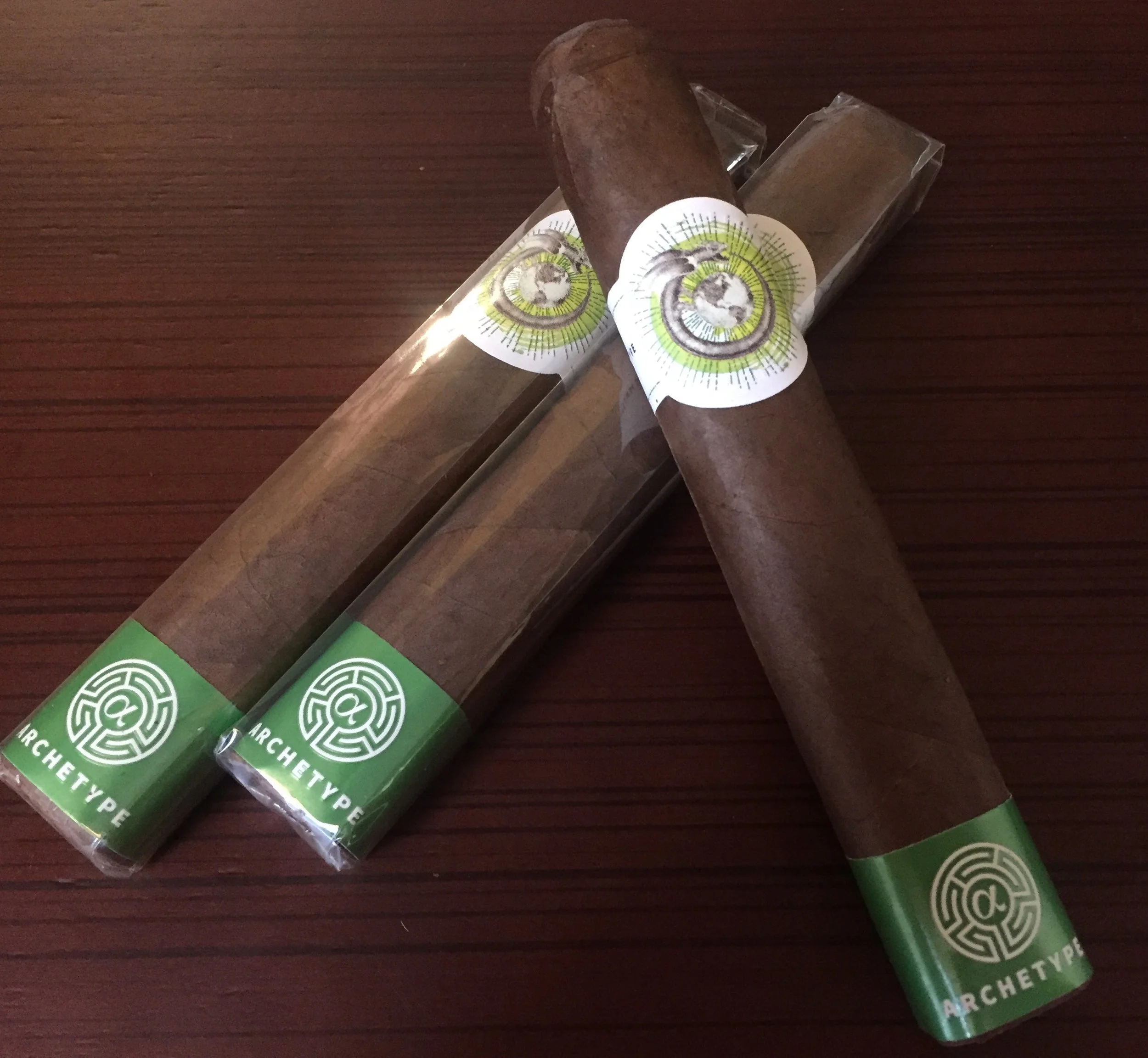 The Archetype Strange Passage is certainly eye-catching, with a green foot band marked with a white Greek letter 'alpha,' set within a labyrinth pattern, above the name “Archetype.” The primary band is white, and features a green, “painted” circle background, with an image of a winged ouroboros encircling the Earth. Both bands contrast against the soft, milk chocolate Habano wrapper, which is almost perfectly smooth, with just a couple of veins running lengthwise along the barrel. A faint coating of oil can be detected with the fingertips, and the stick is softly box pressed. It has a neat double cap, which graciously accepts my wide-gauge punch with no problem.