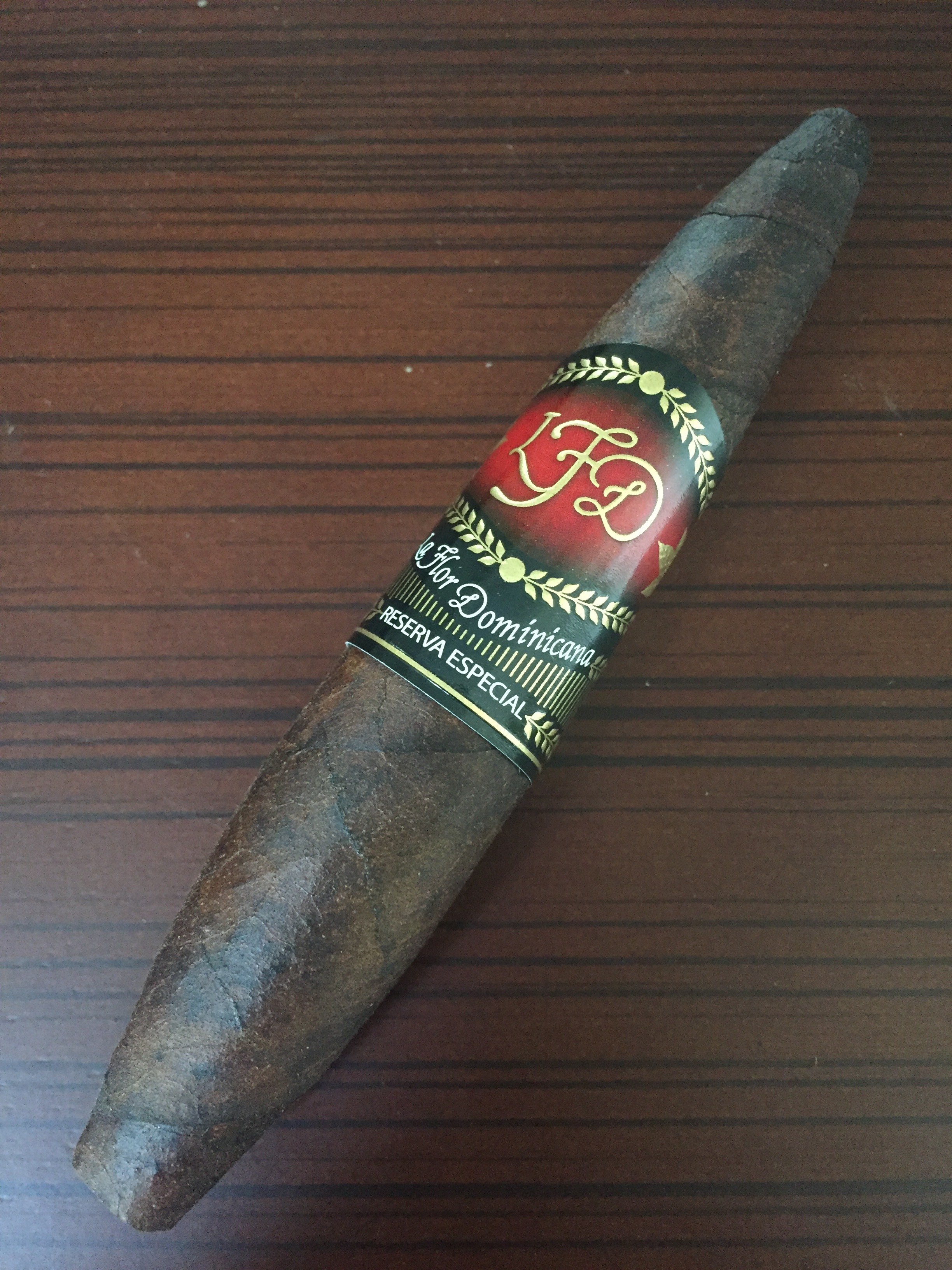 This is a neat little perfecto, with LFD's black, red, and gold band, featuring the LFD monogram in gold stylized lettering over a red background. The wrapper itself is a dark, mottled brown, and you can see just looking at it how toothy and oily it is. It's nice and smooth, with a few veins here and there, and the feel of that oil on the fingers is... just fantastic.